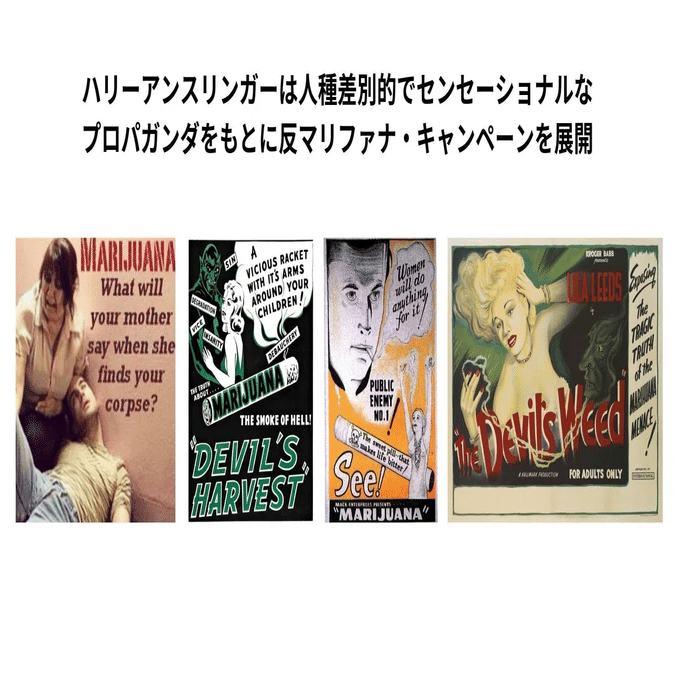 アンスリンガーは、人種差別的な偏見を利用し、大麻の使用を犯罪と結びつけるキャンペーンを展開していきます。